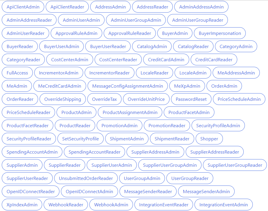 - Roles – this is data access, which can be granularly assigned, for example, BuyerReader, BuyerAdmin, OrderAdmin, etc.:
