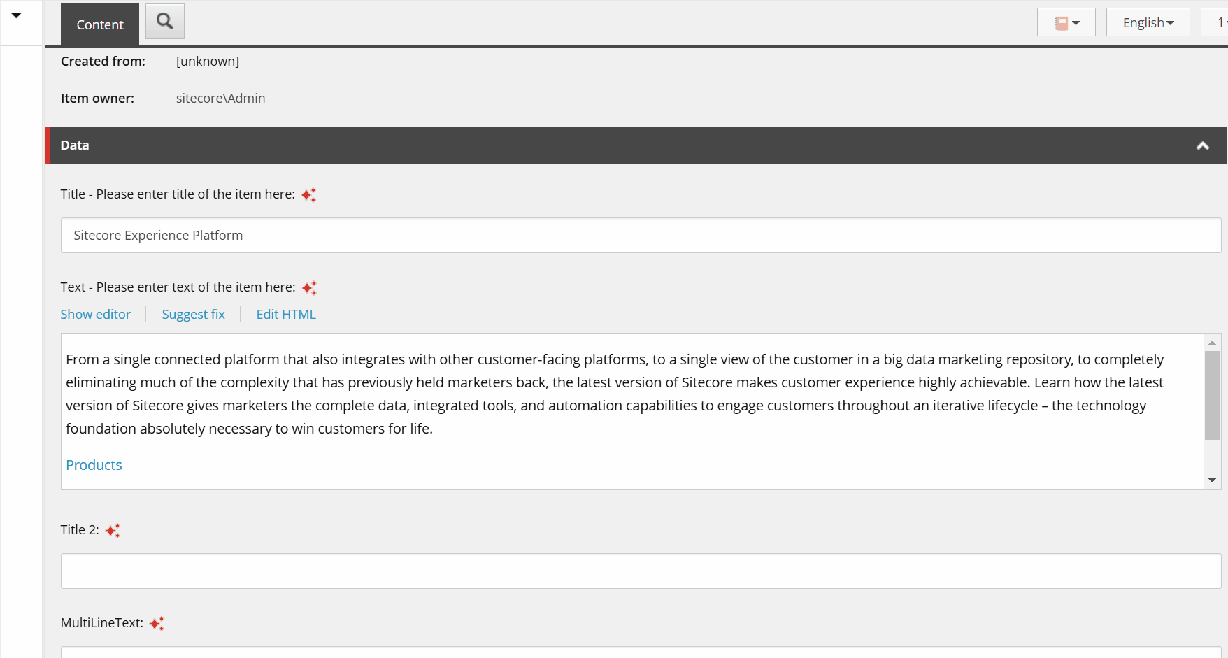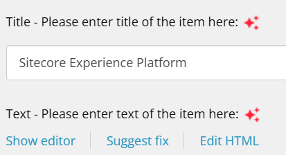 When the Sitecore Stream for Platform DXP is installed and configured, you’ll discover the new red stars button beside the Single-Line Text, Multi-Line Text and Rich Text fields: