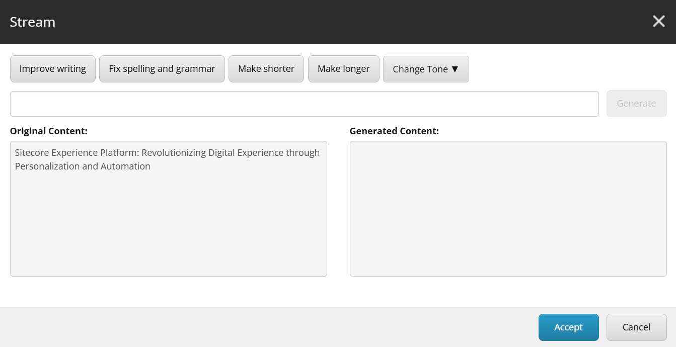 2. Prompt and use the original content as context. If you have a content, you still can prompt and then the Sitecore Stream will take into account the both values to generate a new content. You can click the Generate button as many times as needed to see different variants.