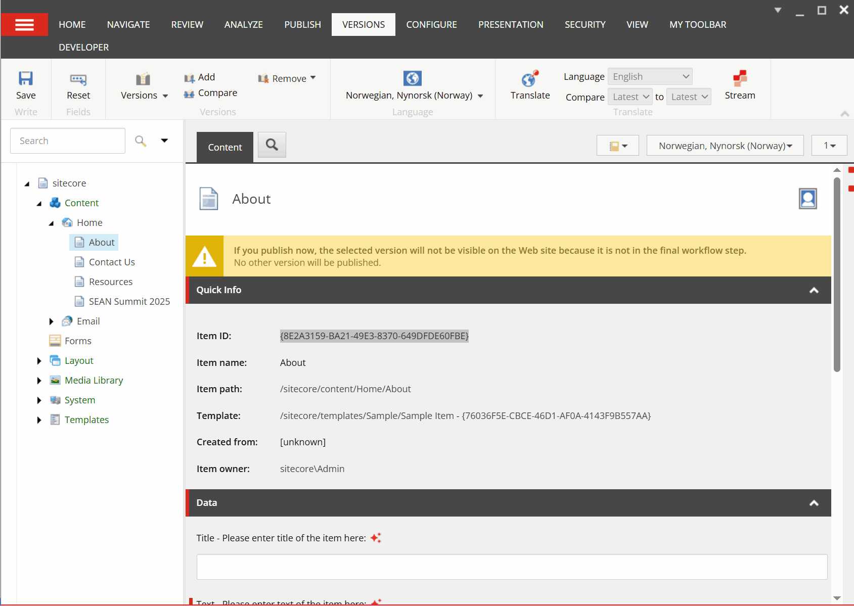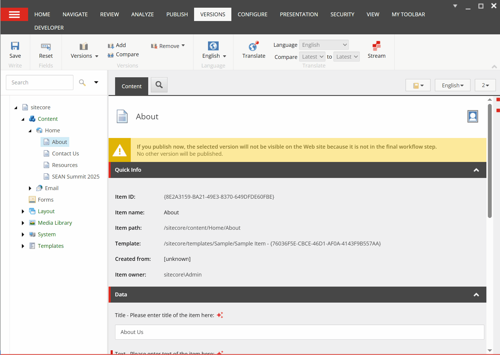 Now, when you navigate to the item that doesn’t have a version in a particular language (e.g., French), you will see the new message – Add a new version with Stream Translate: